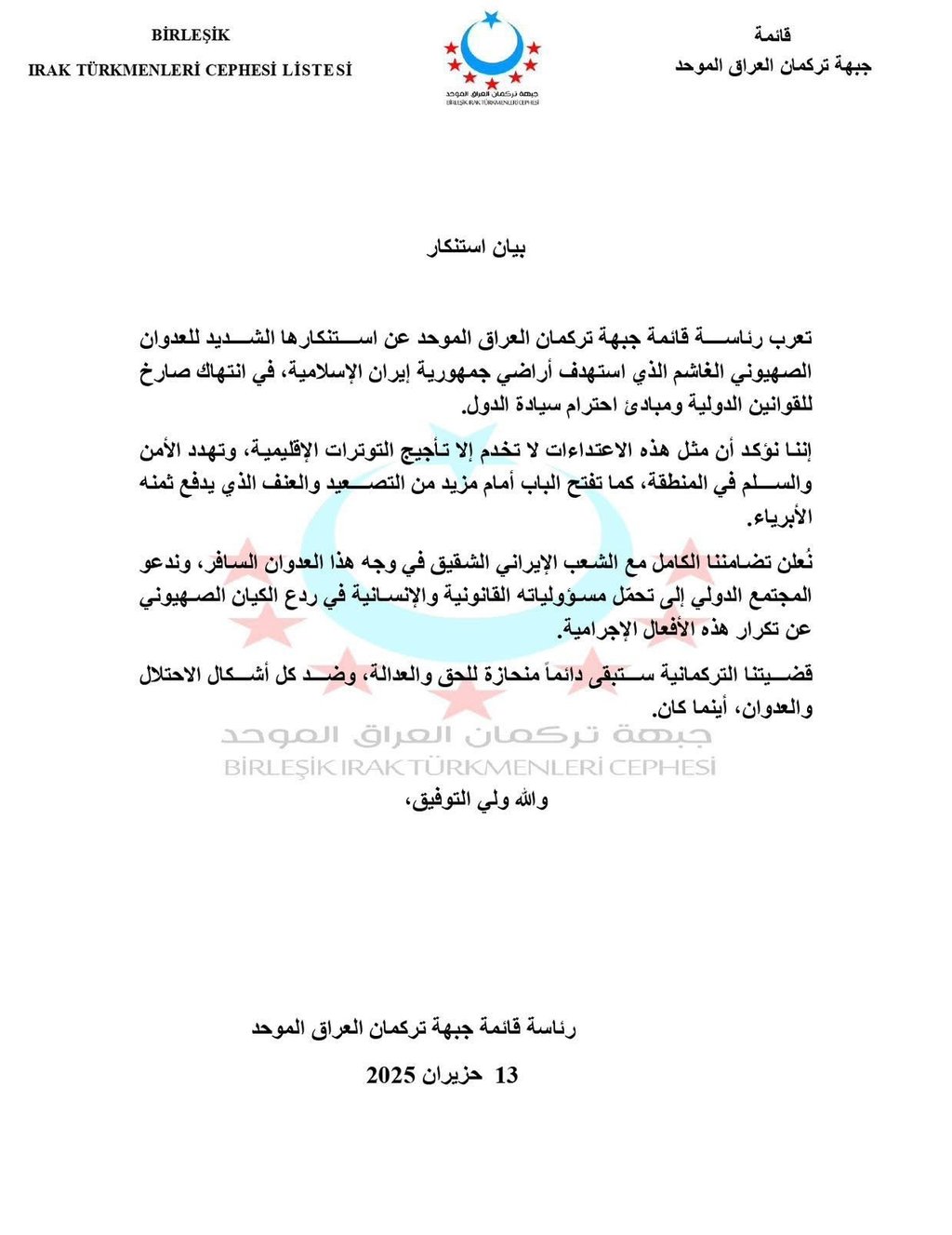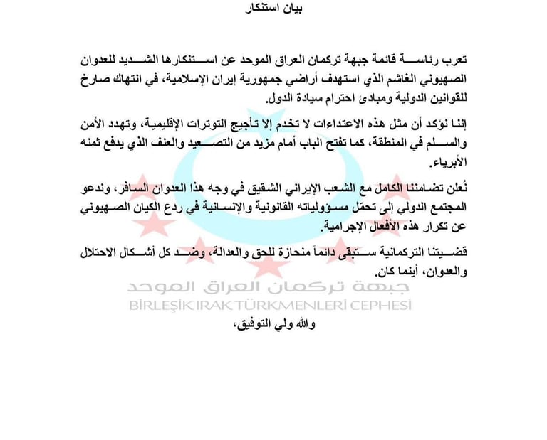 تعرب رئاسة قائمة جبهة تركمان العراق الموحد عن استنكارها الشديد للعدوان الصهيوني الغاشم الذي استهدف أراضي جمهورية إيران الإسلامية، في انتهاك صارخ للقوانين الدولية ومبادئ احترام سيادة الدول.