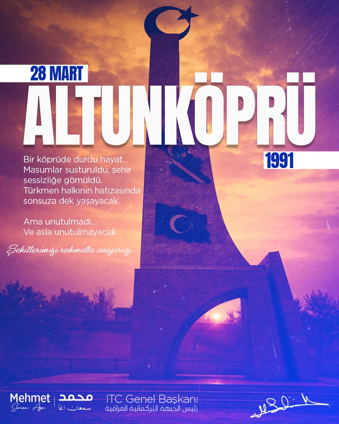 الرحمة والخلود لشهداء التون كوبري وتازة خورماتو وطوزخورماتو وكركوك، الذين ستبقى تضحياتهم رمزاً للفداء في ذاكرة الشعب التركماني.